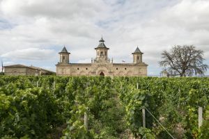 October 6, 2016 — With four turreted towers and flags flying, Château Palmer looks like a small, perfect castle surrounded by a vineyard, proudly situated in the Margaux commune of Bordeaux. Right now its vines are heavy with bunches of purple merlot, cabernet sauvignon, and petit verdot grapes. Harvest is here.
